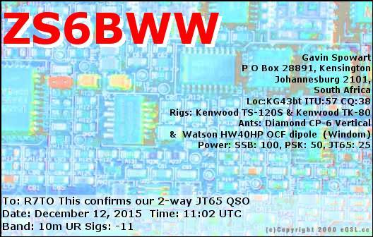 R7TO DE ZS6BWW , JT65 on 10M